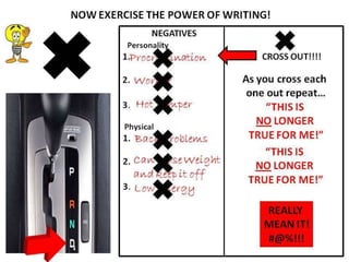 This document outlines a licensed life coaching session designed to help participants identify and break through negative life patterns and beliefs, referred to as 'glass ceilings.' It emphasizes the law of sowing and reaping, asserting that one’s expectations and beliefs directly influence their life outcomes. The session encourages active participation to replace negative thoughts with positive affirmations, ultimately aiming for personal transformation and success.