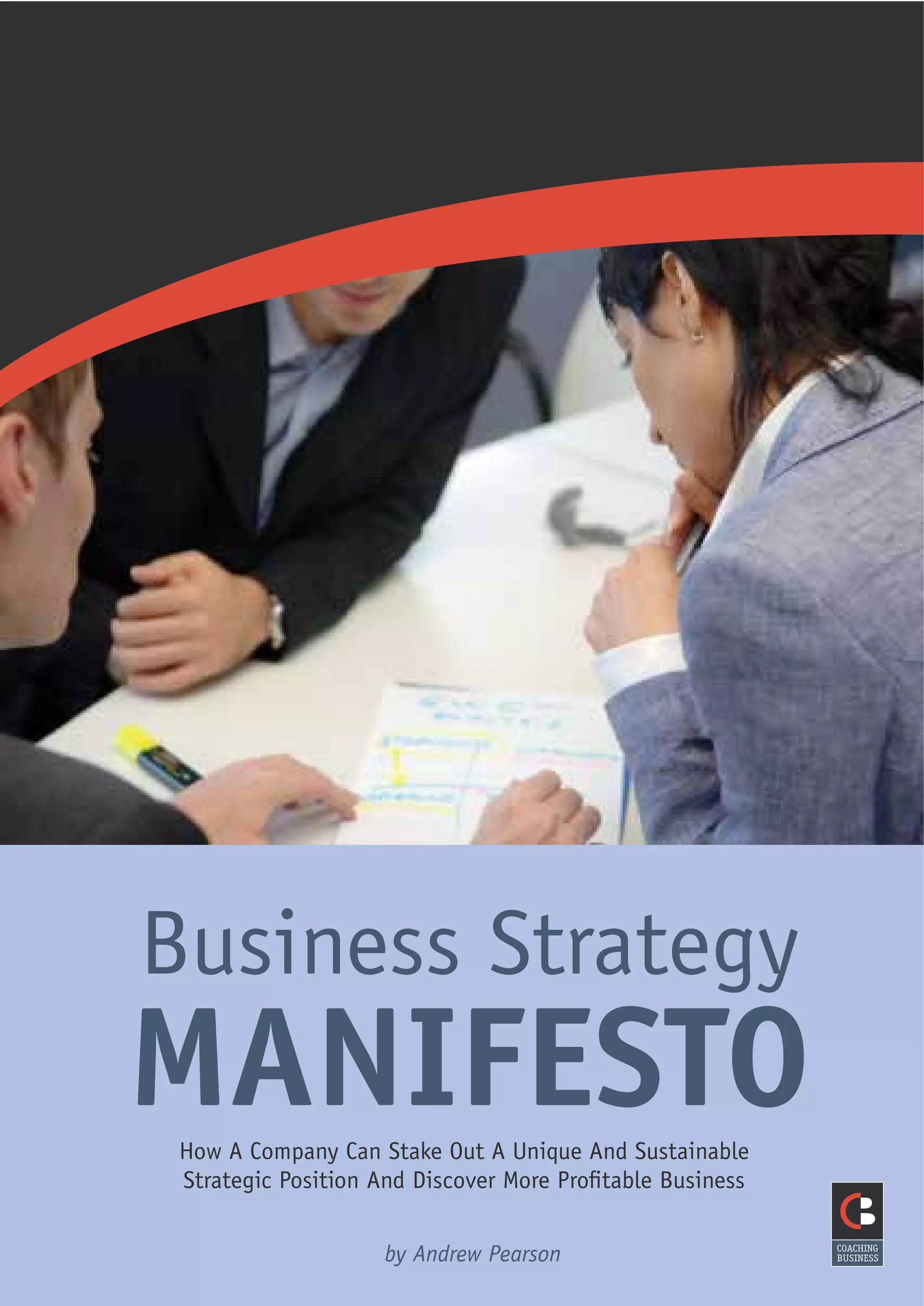 This document is a manifesto on business strategy written by Andrew Pearson. It discusses how companies can stake out a unique and sustainable strategic position to discover more profitable business opportunities. The document is divided into seven parts that cover topics such as strategy formulation, defining a unique strategic position, sustaining competitiveness, and implementing strategies. It emphasizes the importance of continuously innovating, redefining business models, leveraging strategic assets, and involving managers in the creative process of strategy development. The overall message is that companies need dynamic strategies to stay ahead of competition and maintain a competitive advantage through breakthrough opportunities.