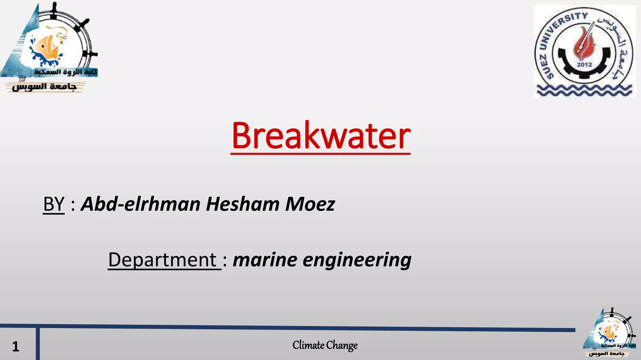 The document discusses coastal erosion and the function of breakwaters in protecting harbors from wave action. It outlines types of breakwaters, including natural rock and concrete, and considerations for their construction, such as foundation type and wave height. Additionally, it covers floating breakwaters, their efficiency, and their limitations.