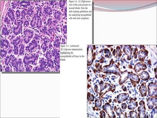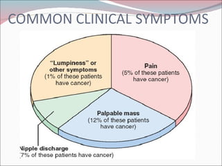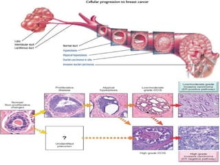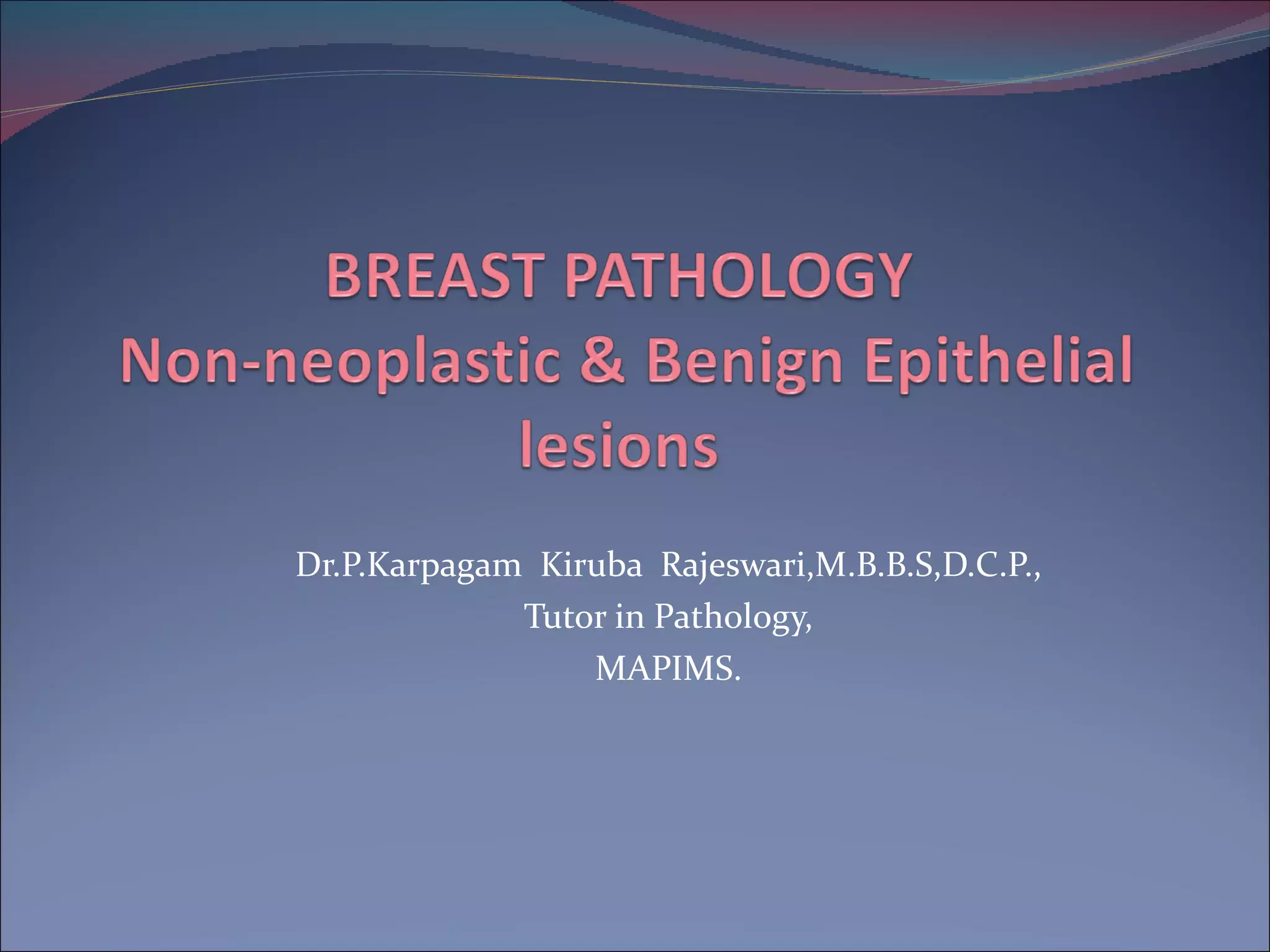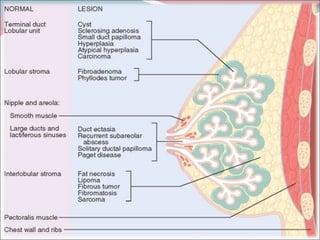 The document summarizes the anatomy and histology of the normal breast as well as various benign breast conditions. It describes the lobes, ducts, lobules and stroma of the breast. It then discusses various benign breast diseases and alterations including acute mastitis, periductal mastitis, duct ectasia, fat necrosis, granulomatous mastitis and various proliferative breast diseases without atypia.