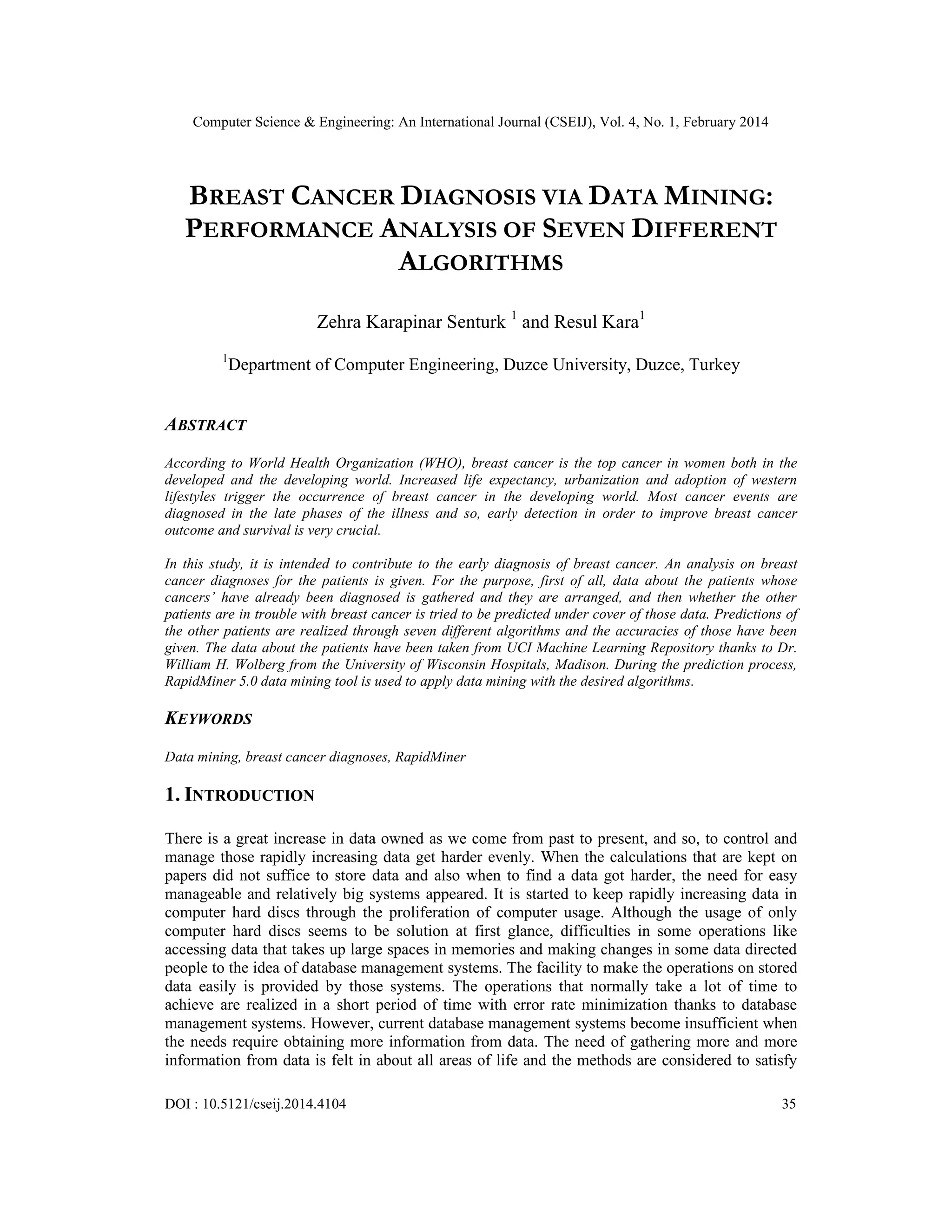 The document examines breast cancer diagnosis through data mining techniques using seven different algorithms to improve early detection and patient outcomes. It utilizes data from the UCI machine learning repository and analyzes the effectiveness of algorithms such as discriminant analysis, artificial neural networks, and support vector machines in predicting breast cancer cases. The findings aim to contribute to timely diagnosis and potentially enhance treatment efficiency.