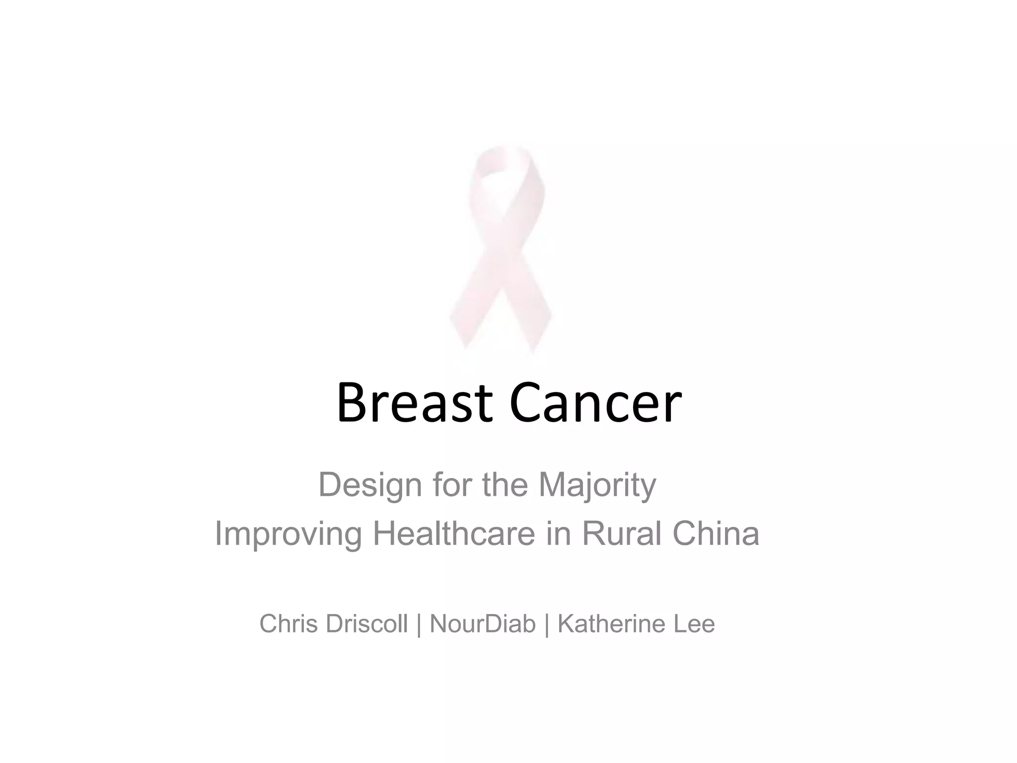 This document proposes solutions to address the growing rates of breast cancer in rural China. It aims to provide education on breast cancer causes and prevention, offer screening resources, and support patient communities. Key challenges include effective information dispersal in rural areas and developing affordable screening. Research found lack of healthcare information and links between lifestyle, diet, and cancer. The proposal is a mobile clinic with examination rooms, medical equipment, and telemedicine for education, primary care, screening, and treating simple diseases. Shipping containers are suggested for their sustainability, low-cost, and adaptability.