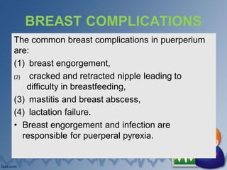 The document discusses common breast complications in the postpartum period including breast engorgement, cracked and retracted nipples, mastitis, breast abscess, and lactation failure. It provides details on causes, signs and symptoms, prevention, and treatment for each complication. Management involves ensuring proper breastfeeding technique, treating any infections, expressing milk to relieve engorgement, and using medications as needed to increase milk production or treat infections.