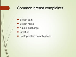 This document discusses common breast disorders and their management. It covers topics such as breast masses, pain, nipple discharge, infections, lactation complications, mastitis, abscesses, inflammatory and non-inflammatory painful conditions. Diagnosis involves history, examination and investigations like ultrasound and mammography. Management depends on the condition and may include antibiotics, analgesia, drainage procedures or surgery. Benign and malignant breast conditions are also differentiated.