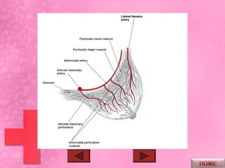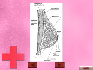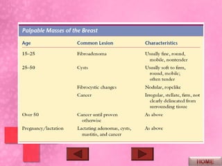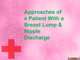 This document discusses the evaluation and differential diagnosis of breast lumps and nipple discharge. It begins by outlining the objectives, anatomy, history, and physical exam findings relevant to evaluating a patient with a breast lump or nipple discharge. It then reviews the differential diagnosis for breast lumps and types of nipple discharge. Investigations like mammography, ultrasound, and biopsy are discussed. Common benign breast conditions like fibrocystic disease and fibroadenomas are also summarized. The document concludes with an overview of breast cancer including epidemiology, risk factors, pathology, staging, treatment, and prognosis.
