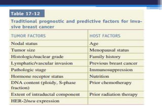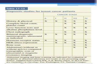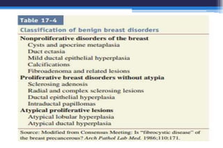 The document discusses various aspects of breast anatomy, pathology, diagnosis, and treatment, highlighting that benign breast disorders affect up to 30% of women, while breast cancer risks are influenced by factors like age and family history. Diagnostic techniques such as mammography, ultrasound, and MRI are outlined, alongside treatment options for conditions like bacterial mastitis, duct ectasia, and breast cancer. The text also emphasizes the importance of triple assessment in diagnosis and distinguishes between different types of breast cancer and their clinical presentations.