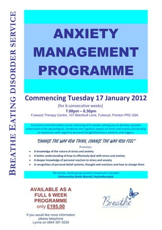 The document announces an anxiety management programme starting on January 17th, 2012 at the Fulwood Therapy Centre in Preston. The 6-week programme consists of weekly 90-minute group sessions with a maximum of 5 people led by a psychotherapist. The goal is to help participants develop a greater understanding of stress and anxiety, recognize personal triggers and thought patterns, and learn effective coping strategies through a practical and informative course.
