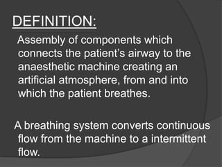 The document discusses various paediatric breathing circuits used in anaesthesia. It describes the key components and classifications of breathing circuits. The most commonly used circuits include the Mapleson A (Magill) system, which is best for spontaneous breathing but requires high fresh gas flows. The Mapleson D and Bain circuits are efferent reservoir systems that work efficiently for controlled ventilation. The Ayre's T-piece is a simple no-valve circuit designed for paediatric use. The document provides details on the construction, functioning and advantages of these different breathing circuit designs.
