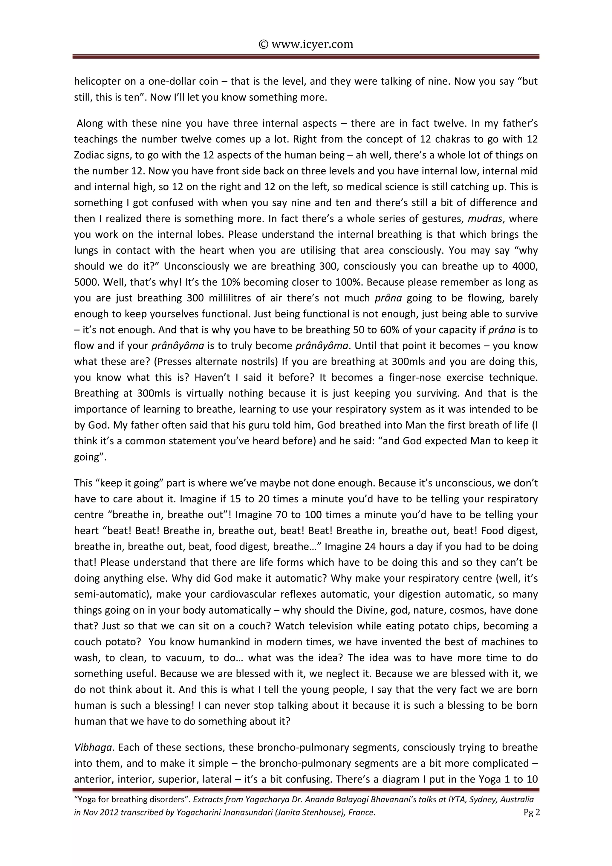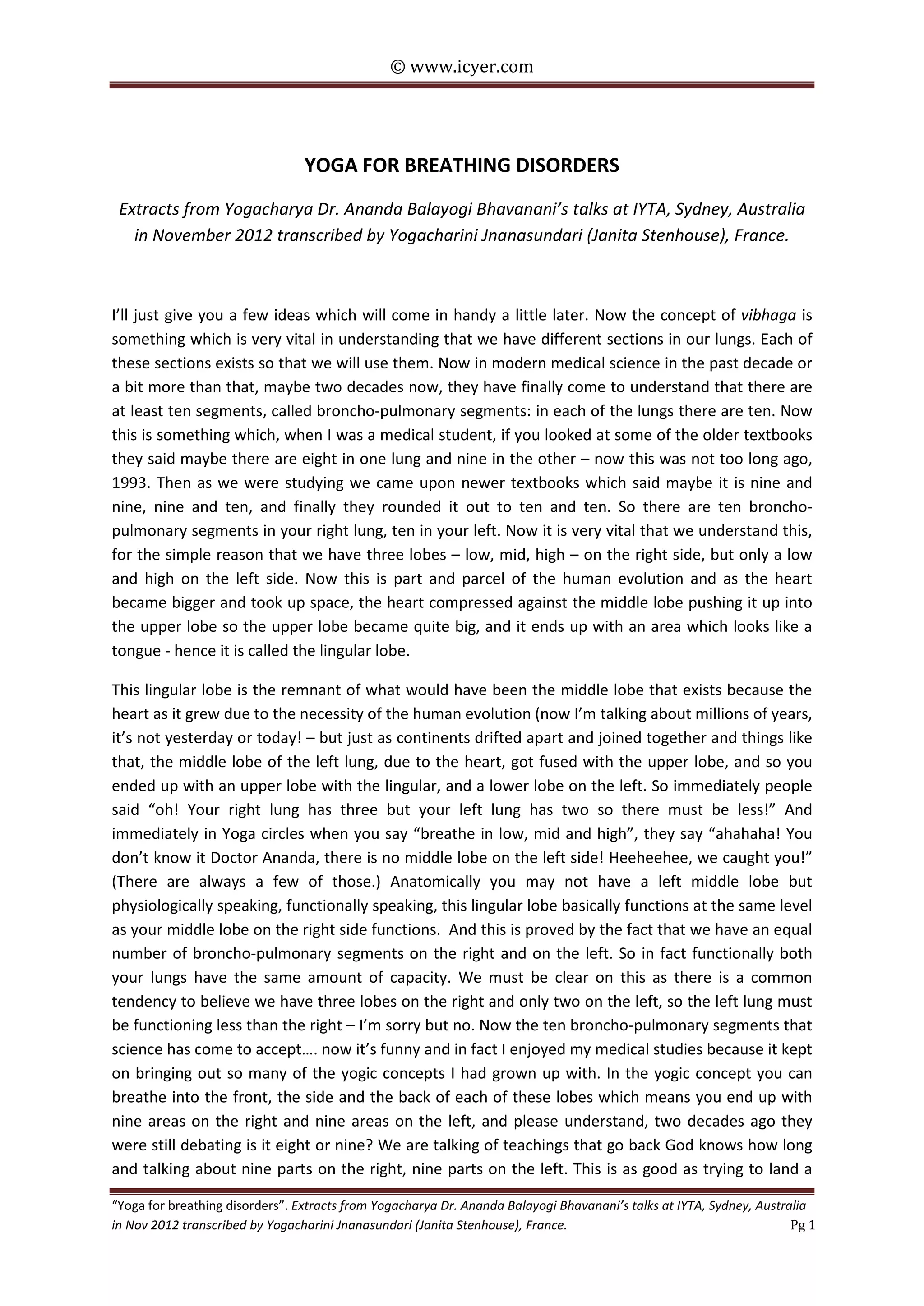 Yogacharya Dr. Ananda Balayogi Bhavanani discusses the anatomy of the lungs and their segments, emphasizing the importance of understanding the bronchopulmonary segments in relation to breathing practices in yoga. He highlights how breath regulation can enhance prana flow, which is essential for healing and overall well-being, challenging common misconceptions about lung capacity. The lecture advocates for conscious breathing techniques to improve respiratory function and health across various conditions.