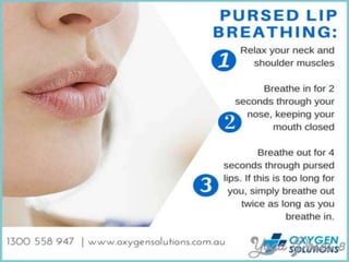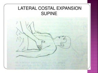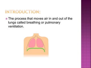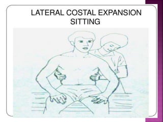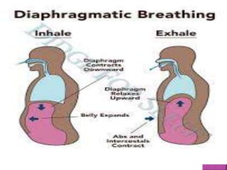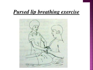 The document discusses breathing exercises and ventilator training for patients with pulmonary diseases or who have undergone surgery. It describes techniques like diaphragmatic breathing, pursed lip breathing, and segmental breathing that aim to improve ventilation, airway clearance, and prevent complications. The types of patients who may benefit are outlined as well as contraindications. Specific instructions for exercises like diaphragmatic breathing and positions are provided.