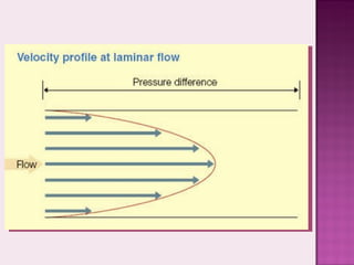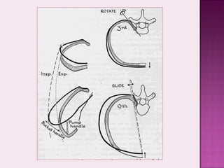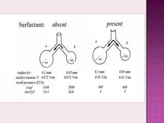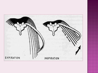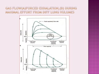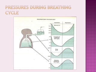 The document discusses the mechanics of breathing and factors that influence gas exchange in the lungs. It describes how the diaphragm and external intercostal muscles cause the chest cavity to expand and contract. This creates pressure differences that allow air to flow into and out of the lungs down a pressure gradient. Resistance to airflow is determined by properties of the airways like their size, branching patterns, and surface properties. Lung compliance and alveolar surface tension also impact gas exchange efficiency in the lungs.