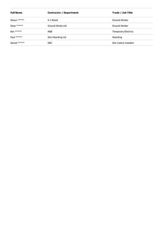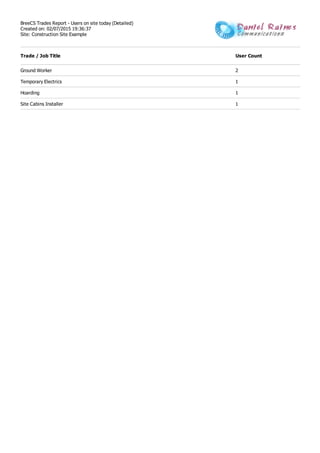 The document provides a detailed trades report for a construction site on February 7, 2015. It lists 5 users on the site including 2 ground workers, 1 temporary electrician, 1 person working on hoarding, and 1 site cabins installer. Each user's full name, contractor or department, and trade or job title is specified.