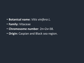 The document discusses grape breeding, focusing on the botanical aspects of Vitis vinifera, including its origin and objectives for developing new cultivars. It highlights the historical introduction of grape varieties in India and the various methods used for breeding, such as hybridization, clonal selection, mutation breeding, and polyploidy. Additionally, it mentions specific promising hybrids and cultivars developed for various uses, including table grapes, raisins, and wine production.