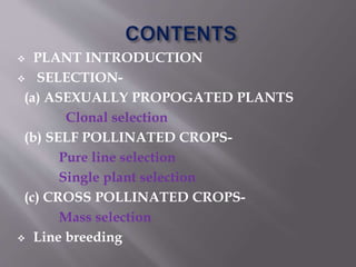 This document discusses various plant breeding methods used to develop new cultivars of vegetable crops, including selection methods, hybridization techniques, and developing hybrid varieties. Some key points covered include: clonal selection is used for asexually propagated crops to develop cultivars like potato and garlic; pure line selection and mass selection are employed for self-pollinated and cross-pollinated crops respectively; line breeding, family breeding, and recurrent selection are population improvement methods for cross-pollinated vegetables; hybridization generates variability for selection and hybrid varieties are made through parent selection, testing combining ability, and producing F1 hybrids.