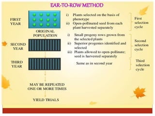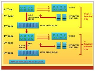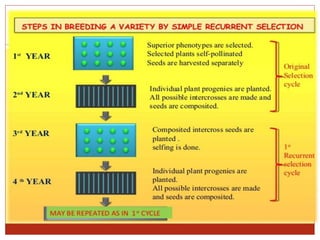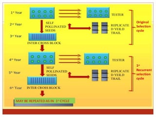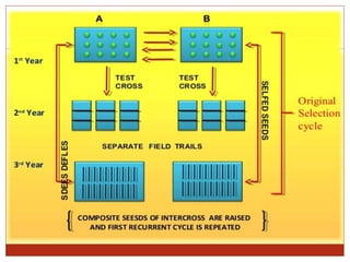 This document provides an overview of plant breeding methods for cross-pollinated crops. It discusses mass selection, progeny selection, and recurrent selection as methods of population improvement. It also describes hybridization techniques like single cross hybrids, double cross hybrids, and three-way cross hybrids. The objectives of plant breeding are to improve traits like yield, quality, disease resistance, and abiotic stress tolerance. Plant breeding has significantly increased global food production through the development of superior crop varieties.