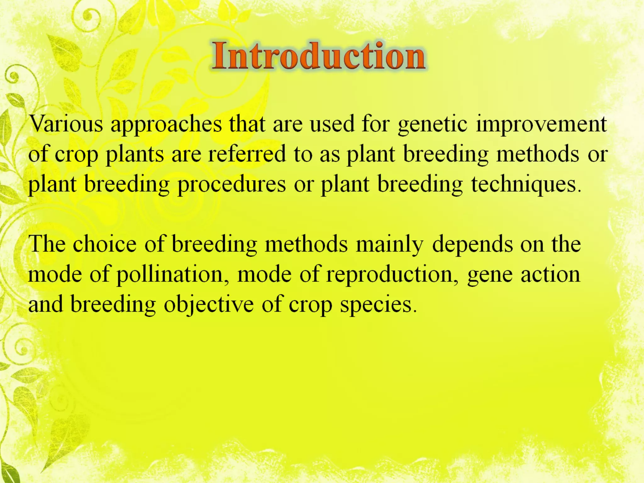 This document discusses methods of breeding in cross-pollinated crops. It describes mass selection, progeny selection (ear-to-row method), modified ear-to-row method, and recurrent selection. It also discusses hybrid varieties, synthetic varieties, and the operations involved in producing hybrids and synthetics. The key methods discussed are mass selection, ear-to-row selection, and recurrent selection.