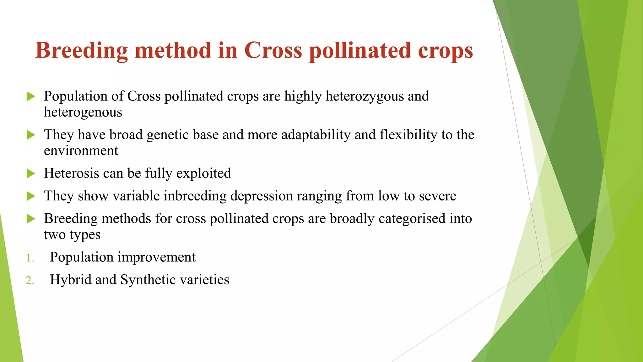 The document discusses breeding methods for cross-pollinated crops, focusing on techniques such as mass selection, ear-to-row method, and progeny selection schemes. It highlights the characteristics of cross-pollinated populations and the advantages and challenges associated with various breeding methods, including their effectiveness in improving traits controlled by multiple genes. In addition, it outlines modifications to traditional methods to enhance selection efficiency and control over pollination.