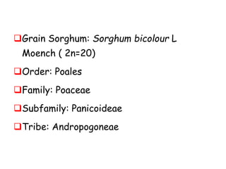 The document presents a comprehensive overview of breeding sorghum, detailing its origins, classification, and the various techniques used in its breeding and cultivation. It highlights the importance of sorghum as a food source, its adaptability to different environments, and the challenges faced in production. Additionally, it discusses breeding objectives, procedures, and the genetic strategies employed to enhance traits such as yield and disease resistance.