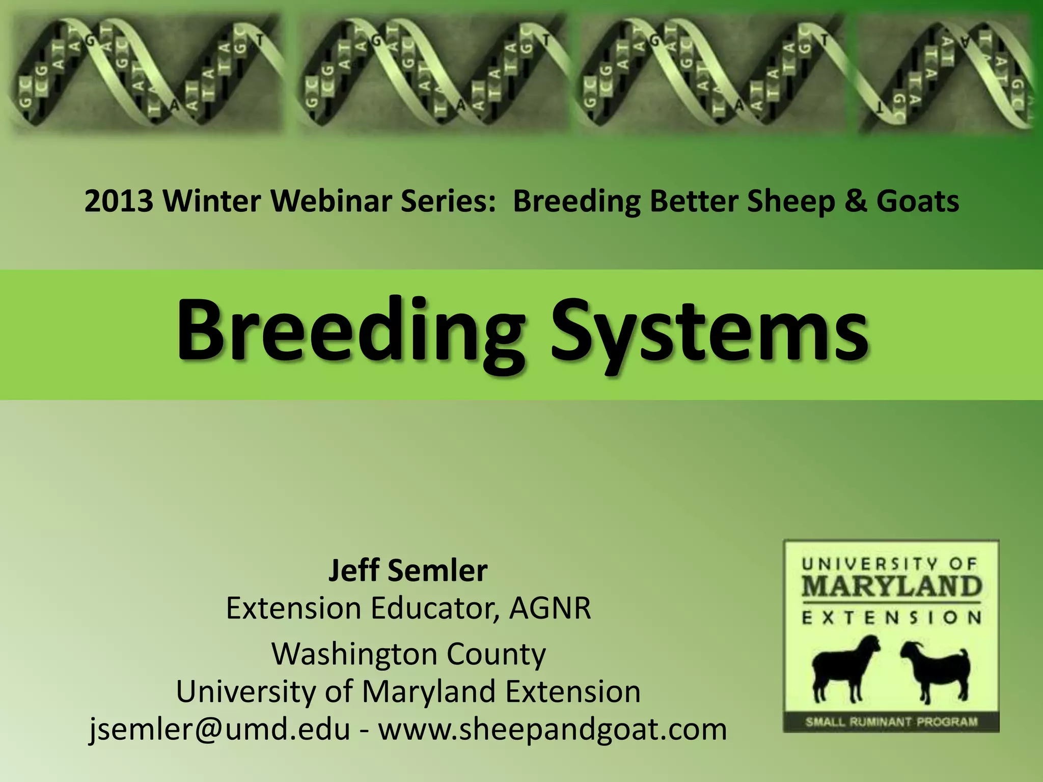 This document summarizes a presentation on breeding systems for sheep and goats. It discusses purebreeding, inbreeding/linebreeding, outcrossing, crossbreeding, and heterosis. Specific breeding systems covered include two-breed crosses, rotational crosses, and terminal crosses. Advantages of crossbreeding include hybrid vigor, utilizing complementarity between breeds, and producing a uniform product. The document provides examples of historic sheep and goat breeds and influential breeders like Robert Bakewell.