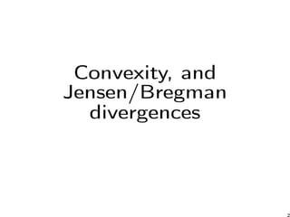 This document discusses generalized divergences and comparative convexity. It introduces Jensen divergences, Bregman divergences, and their generalizations to quasi-arithmetic and weighted means. Quasi-arithmetic Bregman divergences are defined for strictly (ρ,τ)-convex functions using two strictly monotone functions ρ and τ. Power mean Bregman divergences are obtained as a subfamily when ρ(x)=xδ1 and τ(x)=xδ2. A criterion is given to check (ρ,τ)-convexity by testing the ordinary convexity of the transformed function G=Fρ,τ.