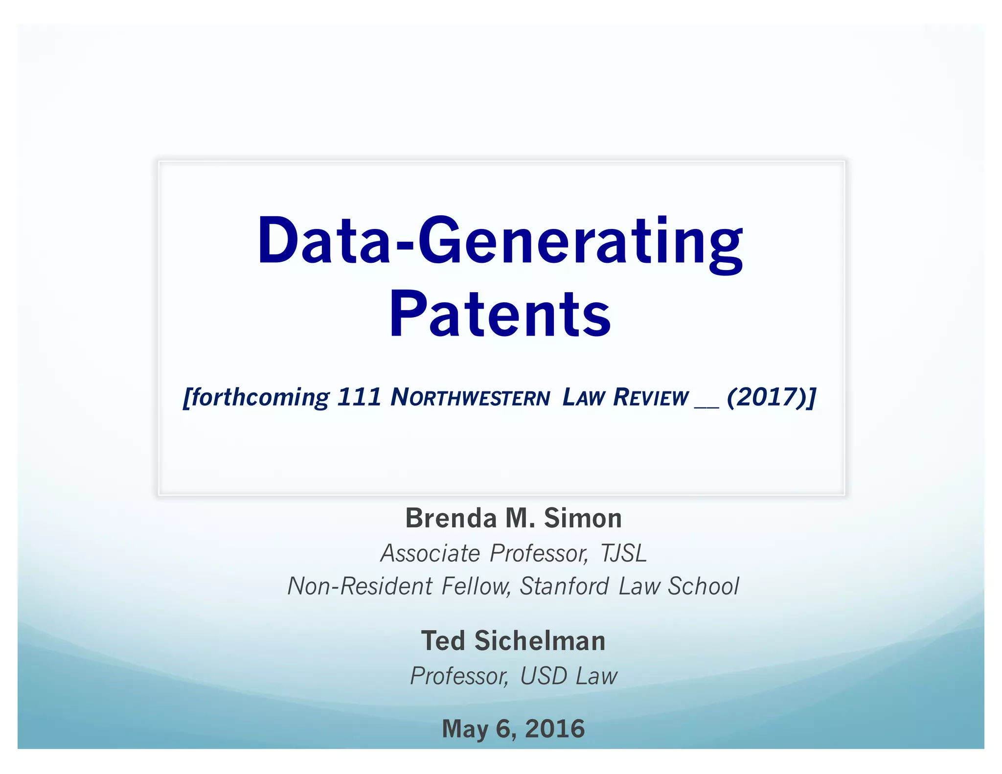 May 6, 2016](https://image.slidesharecdn.com/simonsichelmandata-generatingpatents-160616173031/75/Brenda-M-Simon-The-Pathologies-of-Biomedical-Data-Generating-Patents-Leveraging-Intellectual-Property-and-Big-Data-to-Extend-Market-Power-1-2048.jpg)