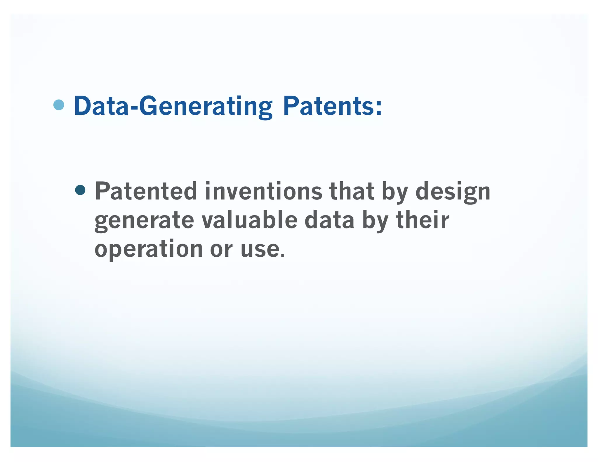 This document discusses data-generating patents, which are patented inventions designed to generate valuable data through their operation or use. It notes potential concerns regarding how these patents can limit disclosure and alter the innovation balance. It proposes analyzing patents based on the foreseeability of the data markets and preemptive effects on data market competition to discern problematic from unproblematic patents. Recommendations to address problematic patents focus on ex post solutions rather than ex ante due to lack of an ideal solution.
