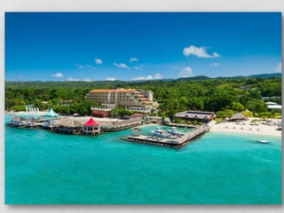This document provides details on honeymoon packages and resort options in Jamaica. It includes pricing and descriptions for a 5-star all-inclusive resort called Sandals Grande Riviera Beach & Villa Golf Resort as well as a 4-star all-inclusive resort called Couples Sans Souci. Both resorts offer couples-only accommodations, dining options, bars, pools, spas, and included activities. The document also provides information on weather and things to do in the city of Ocho Rios, Jamaica.