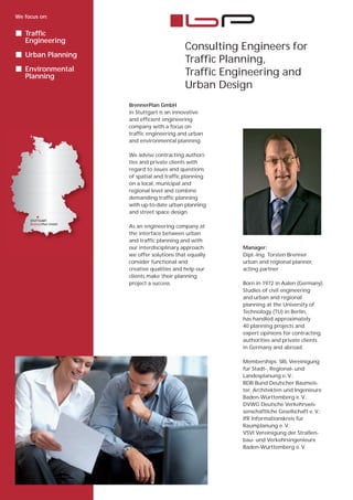 BrennerPlan GmbH is an engineering consulting firm located in Stuttgart, Germany specializing in traffic planning, traffic engineering, and urban design. The firm advises both public and private sector clients on issues related to spatial planning, transportation, and urban development at the local, municipal, and regional levels. BrennerPlan GmbH takes an interdisciplinary approach to developing sustainable solutions that balance functional and aesthetic concerns. Services include traffic analysis, transportation planning, urban planning, environmental assessments, and public engagement.