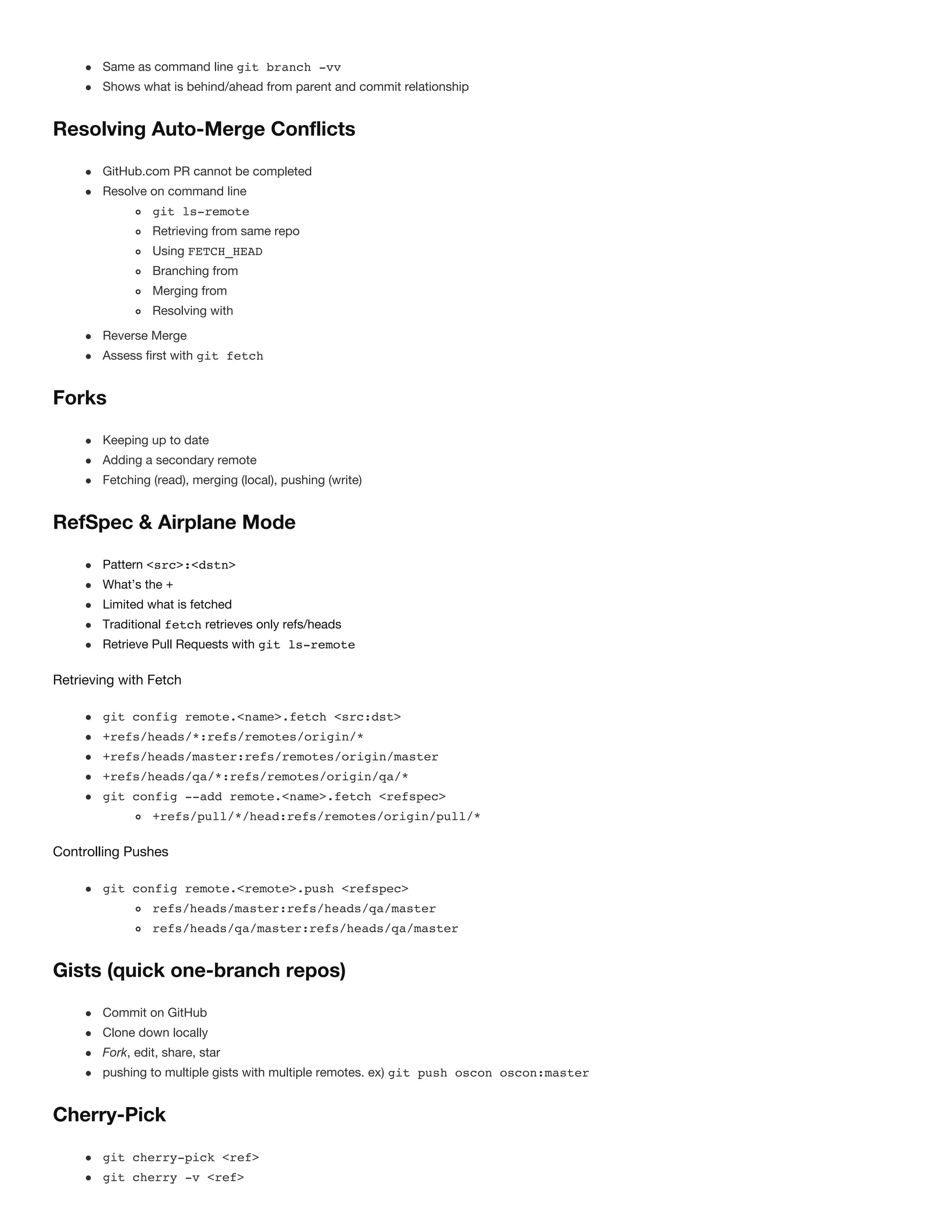 The document summarizes tips and techniques for maximizing use of GitHub, including linking to issues by number in text or commits, auto-updating issues with commit references, resolving auto-merge conflicts either on GitHub or via the command line, keeping forked repos up to date, retrieving pull requests and prototype branches via the command line, and using rebase interactively and cherry-pick to integrate selected commits or work from other branches. The document also provides shortcuts for searching, blaming, and cleaning up local and remote branches.