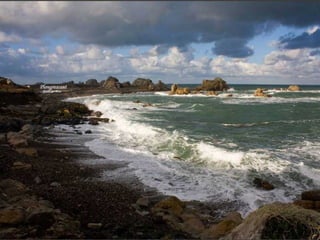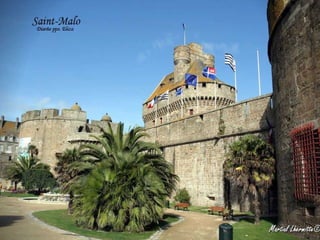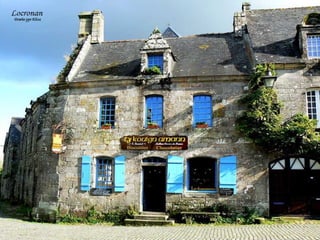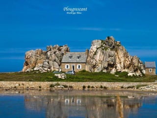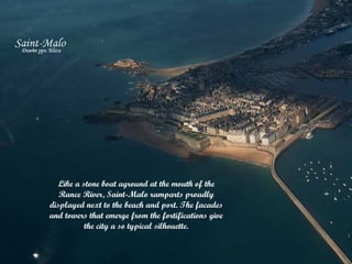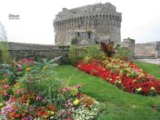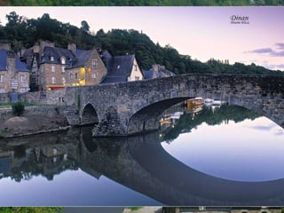 Bretagne is one of the most beautiful and historically important regions in France, located in the northwest of the country. It has a population of over 3 million and its capital is Rennes. Bretagne has an extensive coastline and its economy is based on agriculture, fishing, and tourism. In addition to French, the local Breton language is also spoken in the region. The document goes on to describe several picturesque coastal towns and ports in Bretagne, including Saint-Malo, Dinan, Doëlan, Saint-Goustan, Plougrescant, Josselin, and Locronan, highlighting their medieval architecture and seaside settings.