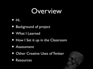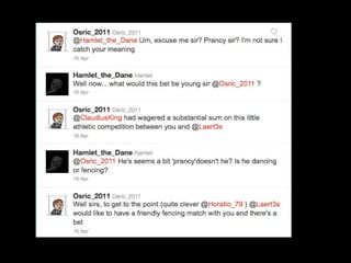 1) The document describes an experiment where a high school English teacher had her students role-play Shakespeare's Hamlet in real time using Twitter accounts for each character.