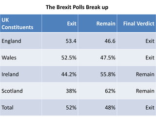 1) The Brexit referendum results showed that England, Wales and the UK as a whole voted to exit the EU, while Scotland and Northern Ireland voted to remain.