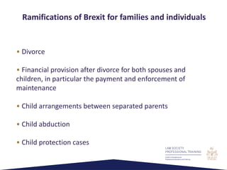 The document discusses the implications of Brexit on family law practitioners in the UK, including challenges related to divorce, maintenance, child arrangements, and the potential for child abduction. It outlines the main EU regulations influencing UK family law and explores various options for maintaining legal cooperation post-Brexit, emphasizing the need for a harmonized system to prevent confusion and unfair outcomes for families. The conclusion highlights the uncertainties that may arise from losing reciprocity with EU member states and the importance of a smooth transition in judicial cooperation.