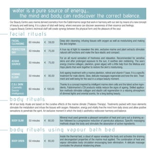 Our Beauty Centre uses marine-derived cosmetics that work in harmony with the skin to promote beauty and well-being. Staff will create synergy between the physical form and soul through facial and body treatments using products containing marine extracts, minerals, and essential oils to cleanse, moisturize, reawaken, and restore skin. Body rituals are based on thalasso therapy and use marine mud and vapors to stimulate metabolism, infuse tissues with oxygen, and allow the mind to relax from daily stress.