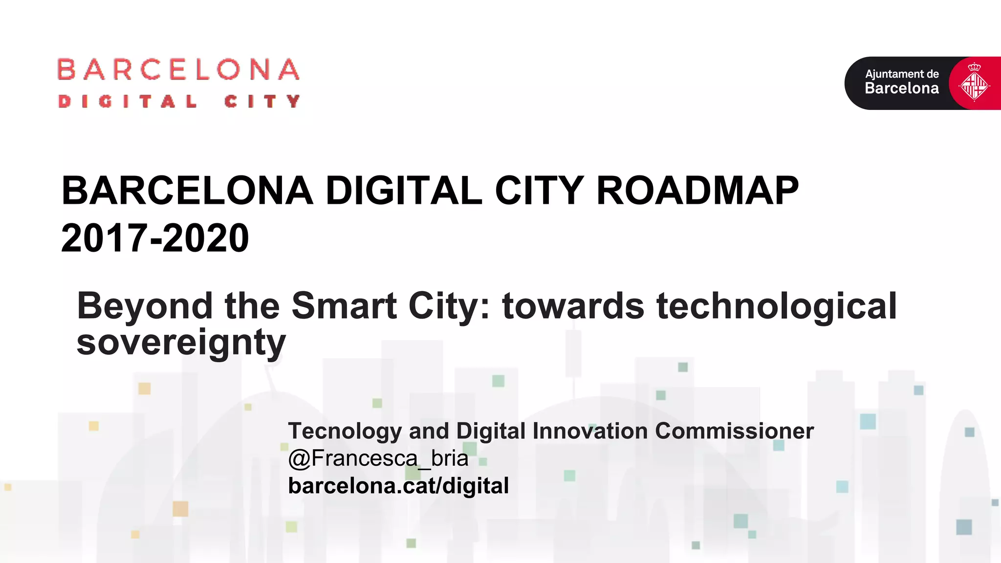 The document outlines Barcelona's Digital City Roadmap for 2017-2020. The main objectives are to empower citizens through digital democracy and data sovereignty, transform government and public services through agile methods and open source technologies, and foster innovation through strengthening the tech sector and facilitating access to public procurement. Key initiatives include developing an open data portal, digital public services, and pilot projects leveraging data for affordable housing, healthcare, mobility and sustainability. The roadmap aims to advance Barcelona's position as a digital and technologically sovereign city.