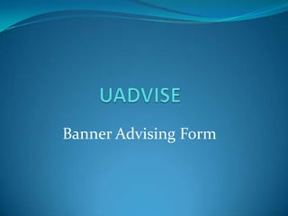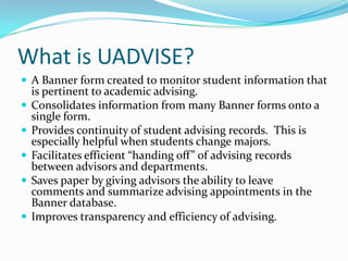 Uadvise is a banner form designed to streamline academic advising by consolidating student information from various sources into one accessible format. It enhances the continuity of advising records, allowing for effective transitions when students change majors and improving overall efficiency through comment features and summarization of advising sessions. The system includes tabs for student information and test scores, facilitating better tracking of student progress.