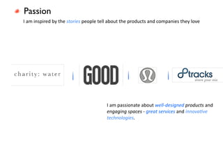 Brian Peterson is passionate about well-designed products, innovative technologies, and engaging spaces. He enjoys playfully navigating the intersection of business, technology, aesthetics, and people. Peterson is always learning and exploring new areas. His goals are to be a thought leader in innovation, become an executive leader or business owner, obtain yoga instructor and nutrition certifications, and create meaningful connections with family. Overall, Peterson aims to contribute to helping address social challenges through meaningful work that benefits both himself and the world.