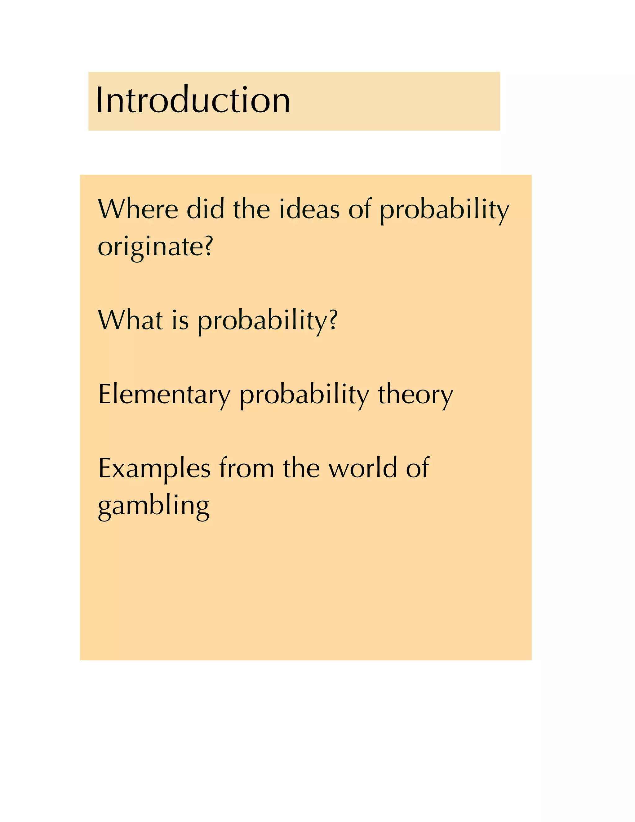 This document discusses probability theory and its applications to gambling. It begins with a brief history of probability theory and its development from Pascal and Fermat's work on gambling disputes. It then covers key concepts like defining probability, outcome spaces, the axioms of probability, and examples of counting combinations and permutations. The document also discusses important probability distributions like the binomial distribution and conditional probability. It provides gambling examples to illustrate concepts like expected value, fairness of bets, and how casinos ensure a house edge through payout odds.