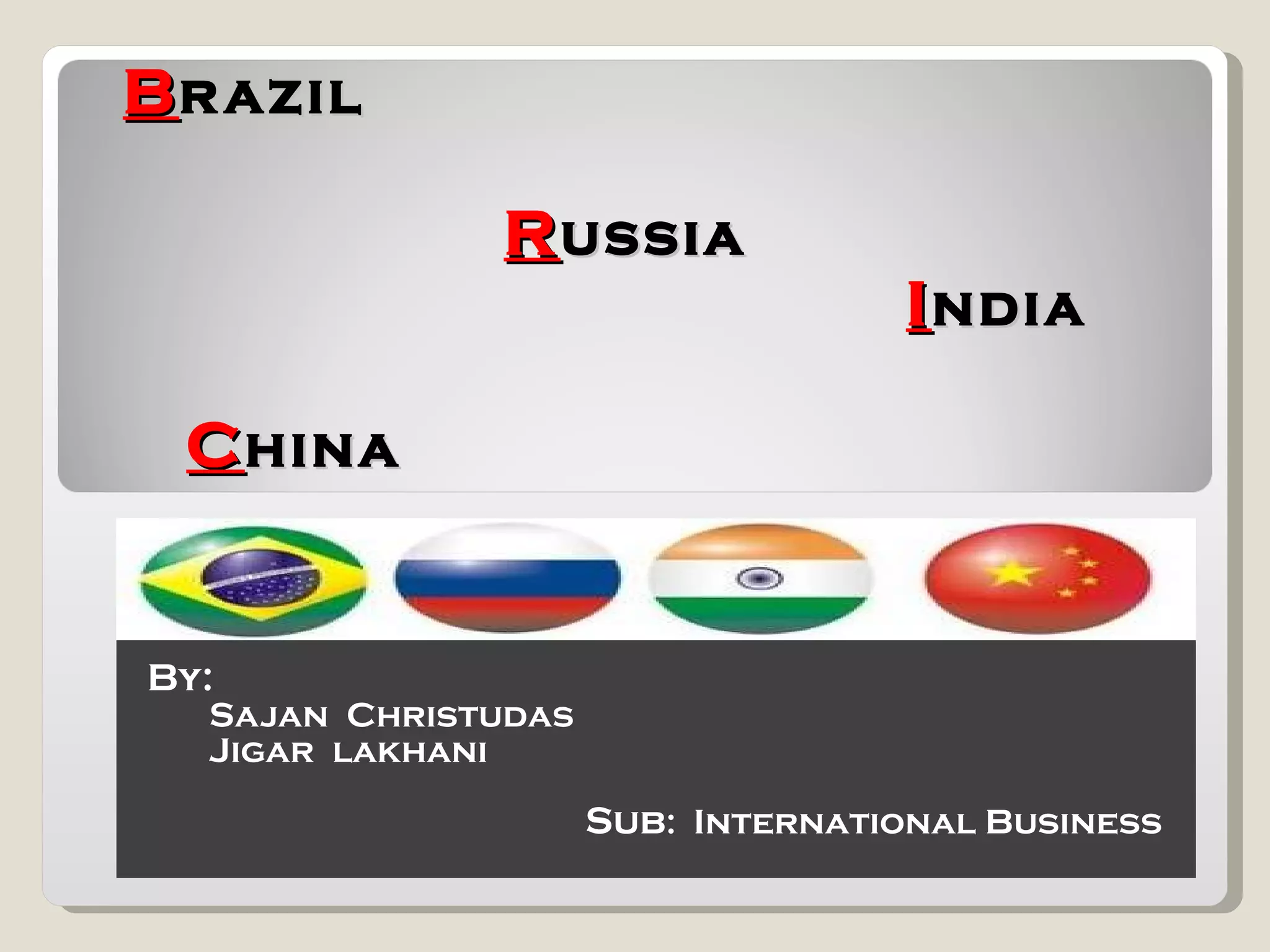 The document discusses key economic factors and statistics for Brazil, Russia, India, and China (BRIC). It notes that together the BRIC countries account for over a quarter of the world's land area and 40% of the global population. Specifically, it provides GDP, GNI, per capita income, labor force participation, and other data for each country. It also summarizes predictions that China and India will be dominant global suppliers of manufactured goods and services while Brazil and Russia will be important raw material suppliers.