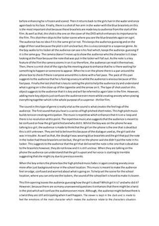 The document provides an in-depth analysis of the opening scenes and techniques used in a thriller film called "Brick". It summarizes that the opening leaves the audience wondering who killed the girl found in a stream and how the boy is involved. Various shots and sounds are described that add mystery and tension, like close-ups of the boy's face and the girl's bracelet in the water. The document analyzes how the film keeps the audience guessing through ambiguous clues and multiple possible suspects to enhance the suspense.
