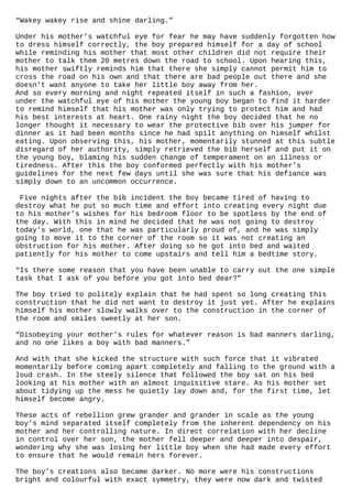 - It all comes to a head when the boy refuses his mother's demands to tidy his room. He throws his Lego at her and declares that "no one likes a woman with bad manners," finally breaking free from her control.