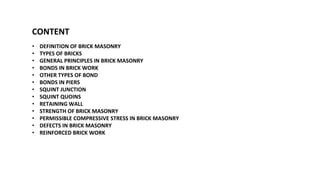 The document provides a comprehensive overview of brick masonry, detailing its definition, types of bricks, construction principles, and various bonding techniques. It covers the strength of brick masonry, permissible compressive stress, and common defects, emphasizing the importance of quality workmanship. Additionally, it discusses reinforced brickwork advantages, types of bonds, and considerations for constructing retaining walls and other masonry structures.
