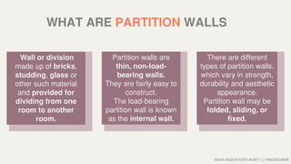 The document discusses partition walls, specifically brick partition walls, which are thin, non-load-bearing structures used to divide spaces. It details their types, advantages, and disadvantages, emphasizing their construction methods and applications in interior design. Additionally, the document highlights different partition systems, including plain and reinforced brick partitions, and their specific features.