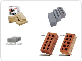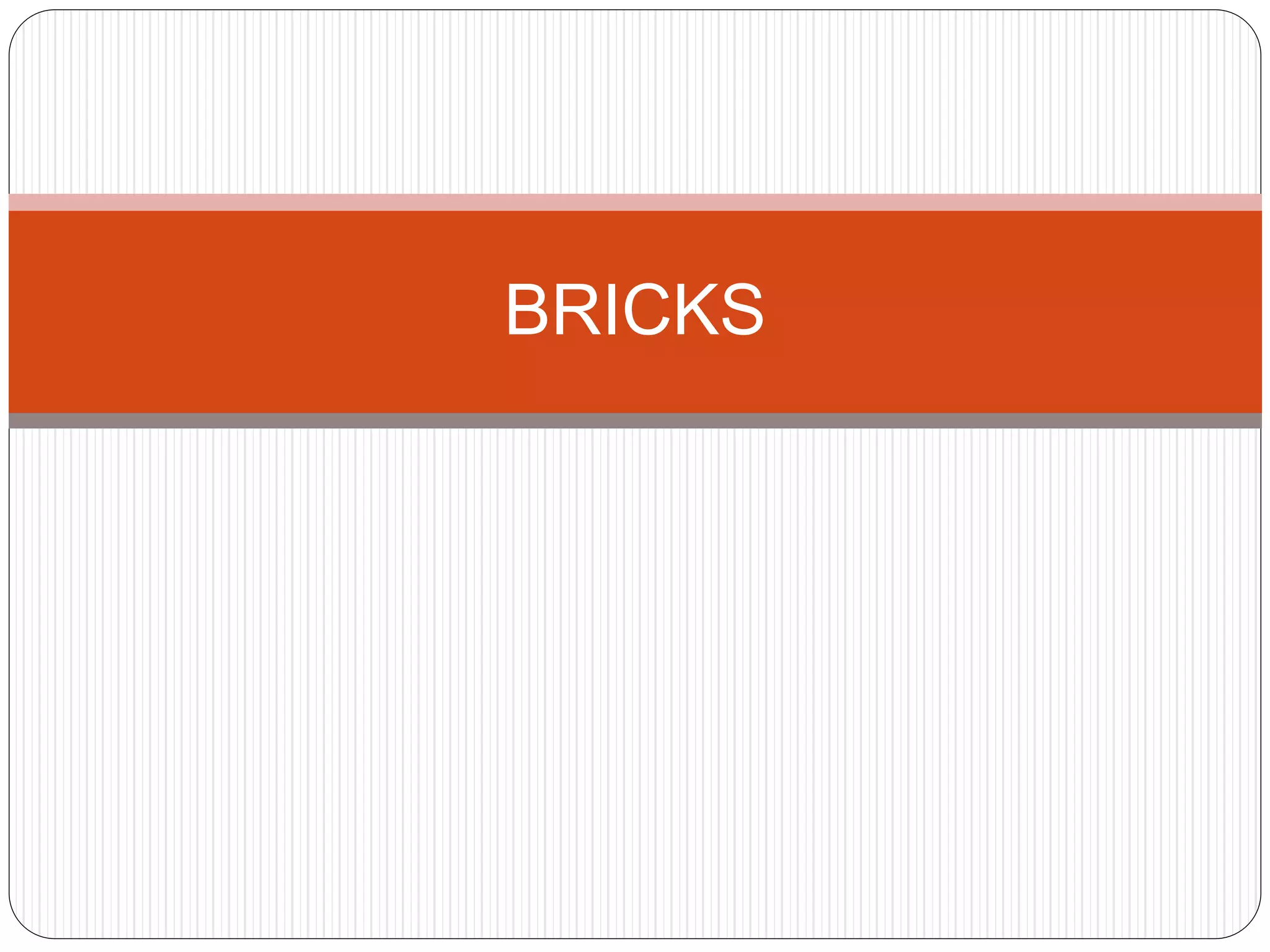 Bricks have been used as a building material since 7000BC, originally made of sun-dried mud but later fired bricks proved more durable. Bricks are now one of the most commonly used building materials after wood. They are manufactured through processes like soft mud, dry press, and extrusion from raw materials like clay, calcium silicate, or concrete. Bricks provide benefits like strength, fire resistance, insulation, and durability making them a versatile and long-lasting building material.