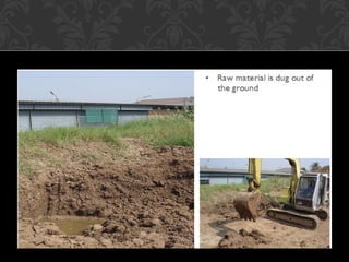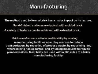 Bricks are manufactured through one of four processes - molded, extruded, pressed, or hand-formed. The manufacturing process involves preparing raw clay materials, forming the bricks, drying them, and firing them in kilns. Different types of bricks include mud bricks, mud-cement bricks, burnt bricks, and cement blocks. Bricks have a variety of structural and decorative uses in buildings, furnaces, pavements, and other construction.