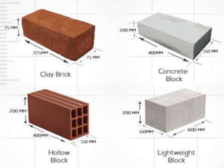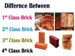 The document discusses bricks, which were first made in ancient Mesopotamia around 4000 BC. Bricks are a building material used to make walls, pavements, and other structures. The document covers the classification of bricks as a specialty product, their nature as a generic product, and introduces their use in construction. It also lists the types of bricks, discusses product development strategies, and provides examples of brick usage like the Great Wall of China which used 8 million bricks.