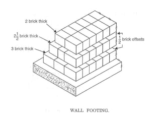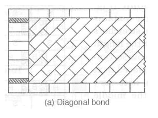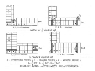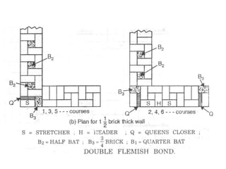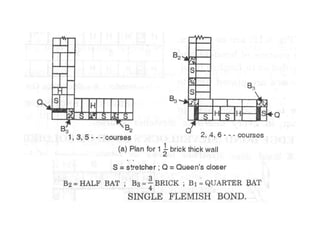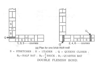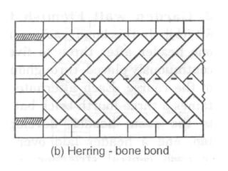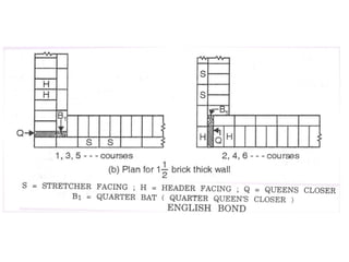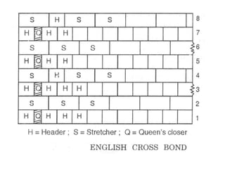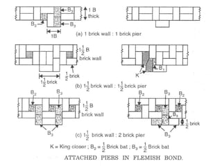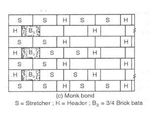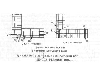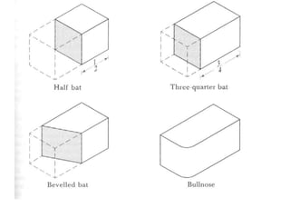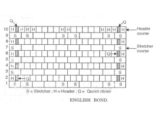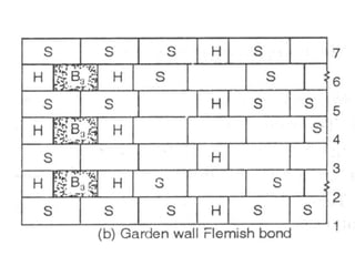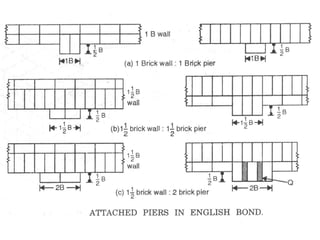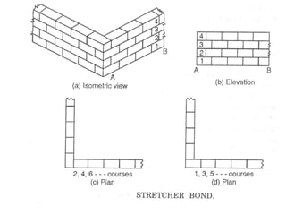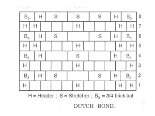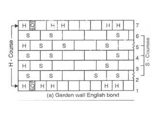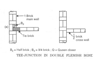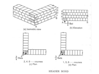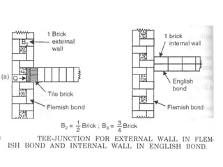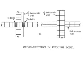 This document discusses various types of brick bonds used in masonry construction. It begins by defining common brick laying patterns such as stretcher, header, soldier, etc. It then explains different bond patterns including English bond, Flemish bond, English cross bond, rat trap bond, Dutch bond, and others. It also covers special bonds used for garden walls. Finally, it discusses bonds used at wall connections, specifically tee junctions, cross junctions, and squint junctions between walls of varying thicknesses.
