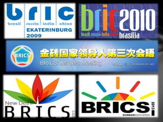 The document provides information on the BRICS nations (Brazil, Russia, India, China, South Africa). It lists the current leaders and finance ministers of each country. It also provides key economic data including GDP, population, area, and other statistics for each BRICS nation as well as in total. The history and developments of the BRICS group are summarized, including details on the first 5 summits hosted between 2009-2013.