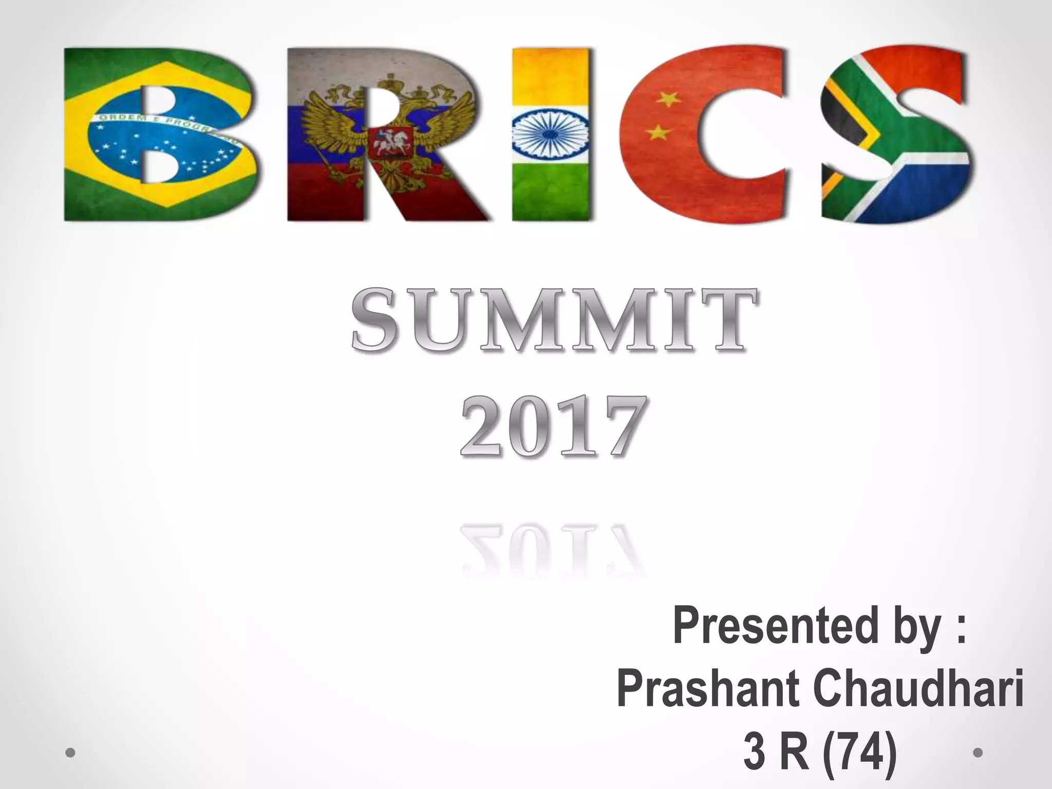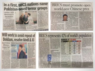 BRICS is an international organization consisting of leading emerging economies Brazil, Russia, India, China and South Africa. The 9th BRICS summit was held in Xiamen, China in September 2017, hosted by President Xi Jinping. Key objectives of BRICS include regional development, economic growth, and establishing the New Development Bank to fund infrastructure projects. Leaders from Brazil, Russia, India, China and South Africa participated in discussions around issues like terrorism and North Korea's nuclear tests.