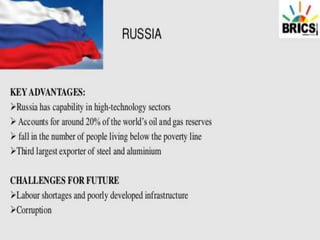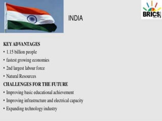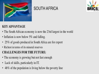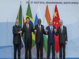 The BRICS alliance was formed in 2001 and includes Brazil, Russia, India, China, and South Africa. It aims to promote economic cooperation, trade, and development between these emerging economies. The BRICS Forum was established in 2011 to facilitate collaboration on social, economic, and environmental issues. Recent BRICS summits have focused on establishing development banks and addressing issues like global governance, trade, healthcare, and sustainable development. The 2018 summit was hosted by South Africa.
